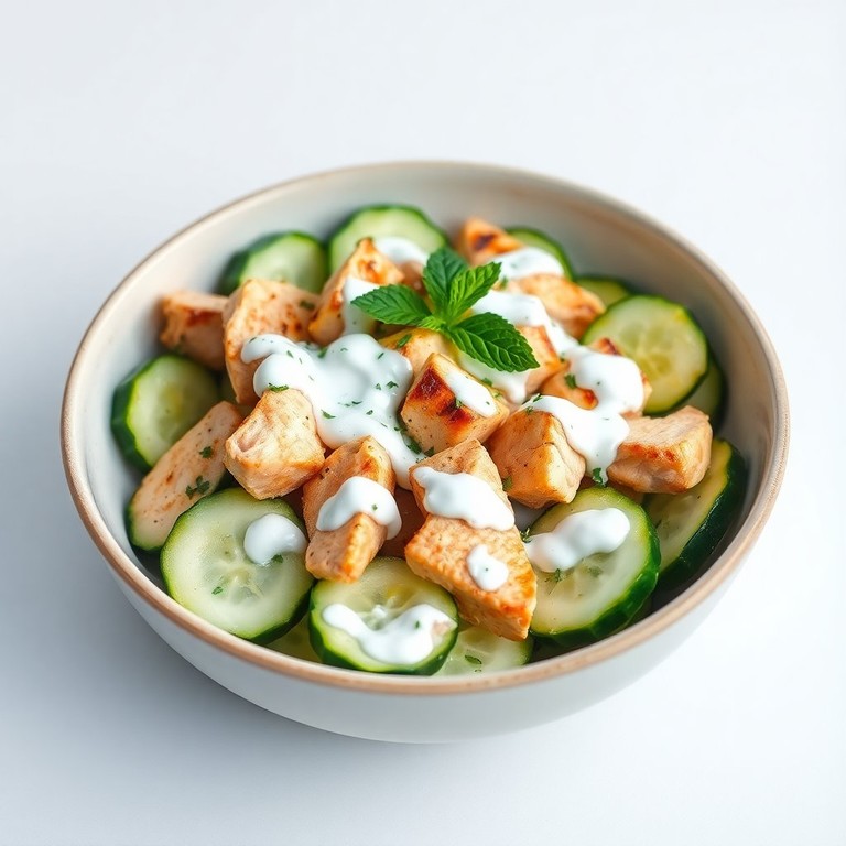 Una mezcla refrescante y saludable para cualquier ocasión, esta ensalada combina la jugosidad del pepino con la suavidad del pollo y el toque cremoso del yogur griego, todo realzado con hierbas frescas.