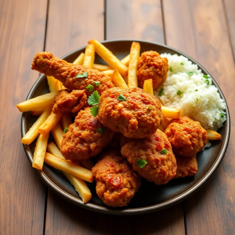 Pollo Frito Crujiente con Arroz y Papas Fritas Doradas