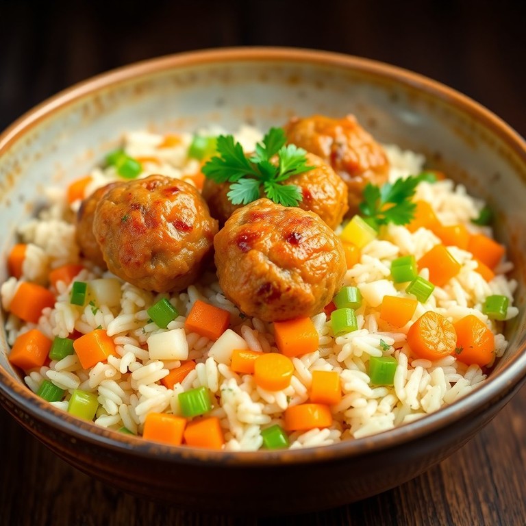 Un plat réconfortant de riz parfumé, accompagné de délicieuses boulettes de viande et de légumes croquants, parfait pour un repas familial.