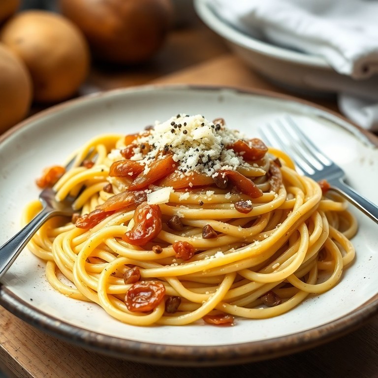 Spaghetti aux œufs crémeux et oignons caramélisés