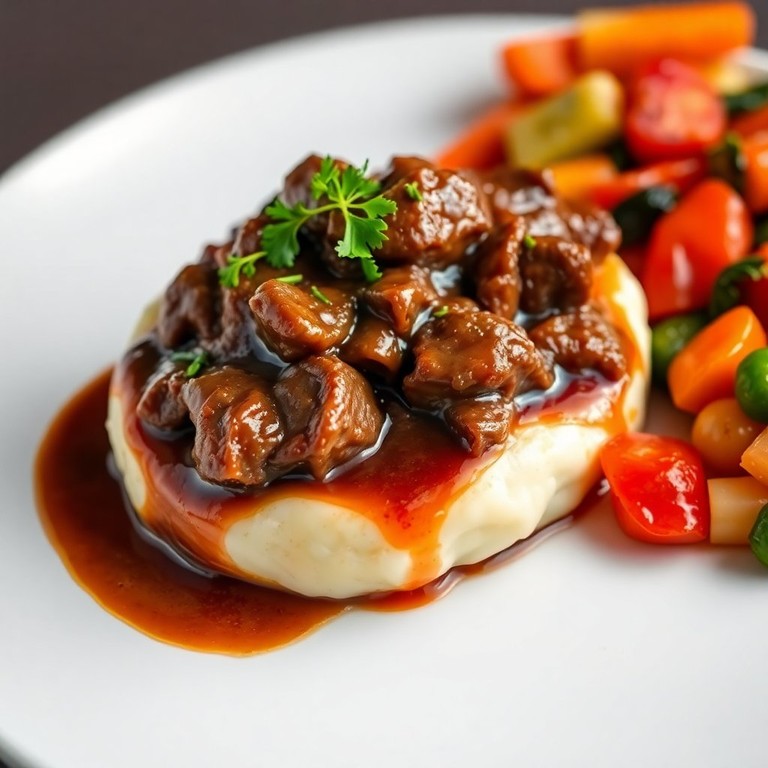 Un delicioso plato de carne de res cocinada en una salsa oscura, acompañada de un suave puré de papas, ahora sin caldo de res ni maicena. Perfecto para una cena reconfortante y más ligera.