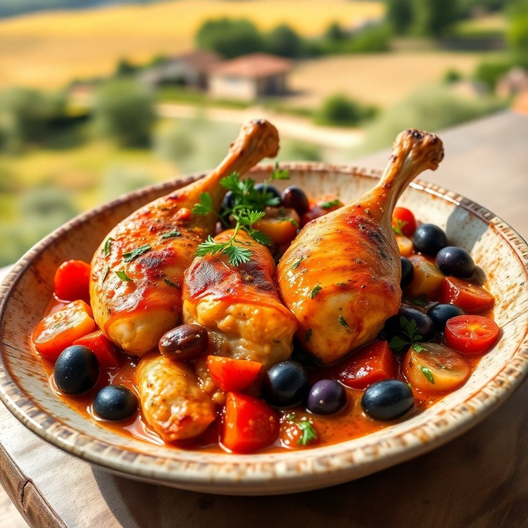 Un délice de poulet mijoté avec des tomates, des olives et des herbes de Provence, pour un goût authentique du sud de la France.