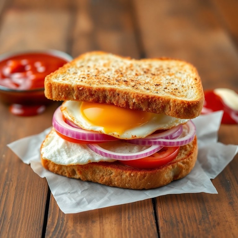 This quick and satisfying sandwich features a perfectly fried egg, fresh onions, and a tangy ketchup-mayo spread on toasted bread, making it a delightful breakfast or snack option.