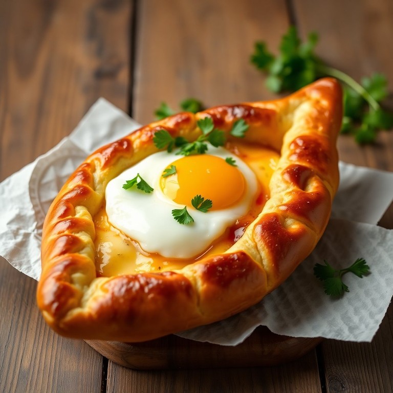 Cheesy Khachapuri Adjaruli is a traditional Georgian dish that features a unique boat-shaped bread filled with a delicious mixture of cheeses and topped with a perfectly cooked egg. This dish is not only a feast for the eyes but also a delightful experience for your taste buds, combining the flavors of rich cheese and a runny yolk. Perfect for sharing or enjoying on your own, this khachapuri is sure to impress at any meal.