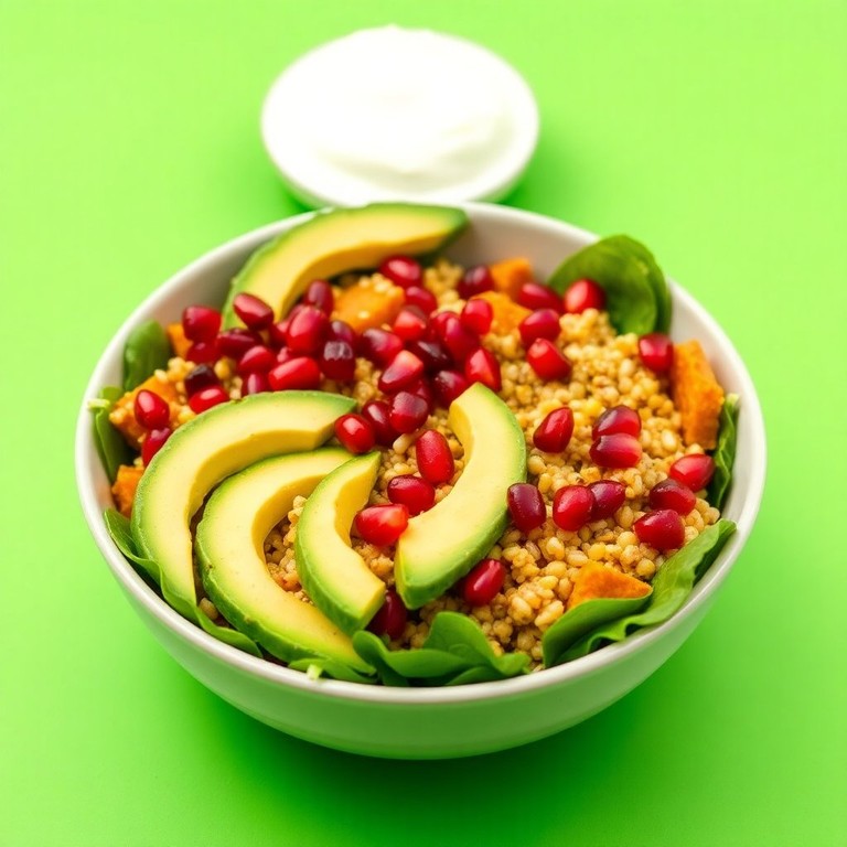 Eine nährstoffreiche Bowl voller Farben und Aromen, perfekt für ein gesundes Mittagessen oder Abendessen. Diese Quinoa-Süßkartoffel-Bowl kombiniert die Süße der gerösteten Süßkartoffeln mit der Frische des Spinats und der knackigen Textur der Granatapfelkerne.