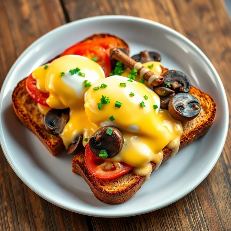 Un brunch élégant avec des champignons sautés, des œufs pochés et des tranches de tomates, le tout nappé d'une sauce hollandaise.