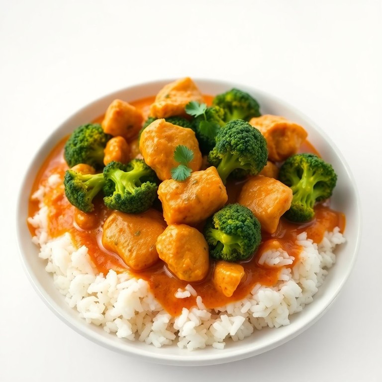 Un plat réconfortant alliant poulet et brocolis dans une sauce au lait de coco épicée, servi avec du riz basmati.