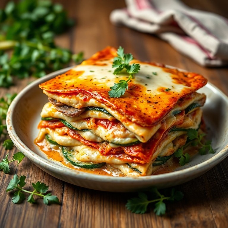 Une délicieuse recette de lasagnes végétariennes, alliant courgettes, champignons et pommes de terre, le tout nappé d'une sauce tomate savoureuse et de crème fraîche, parfait pour un repas réconfortant.