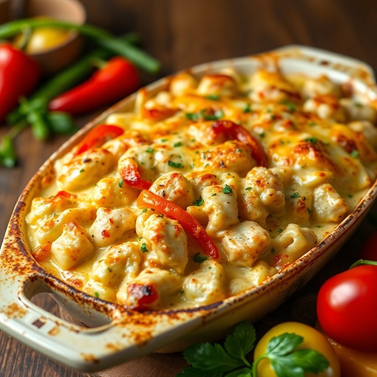 Un plat réconfortant de pommes de terre crémeuses, de poulet juteux et de poivrons colorés, parfait pour un dîner en famille.