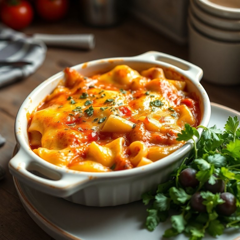 Un plat réconfortant où des pâtes sont mélangées avec une sauce tomate riche, des œufs brouillés et du fromage râpé, cuit au four pour une croûte dorée. Idéal pour un dîner rapide.