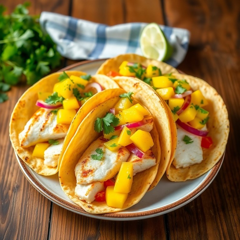 Tacos ligeros y deliciosos hechos con pescado a la parrilla, servidos en tortillas de maíz y acompañados de una vibrante salsa de mango. Ideal para una cena rápida y llena de sabor.