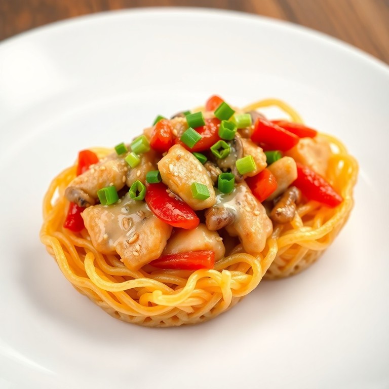 Nids de Nouilles Croustillantes au Poulet et Sauce Crémeuse