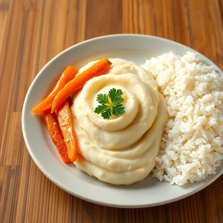 Purê de Batata Cremoso com Cenoura Salteada e Arroz Refogado