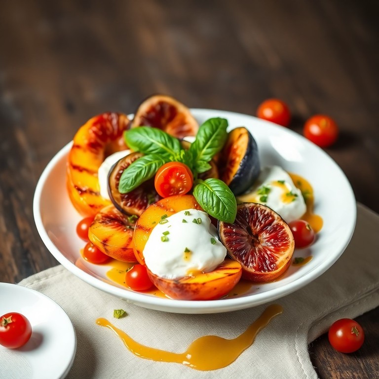 Gegrillte Pfirsichspalten und karamellisierte Feigen, kombiniert mit cremiger Burrata und einem Hauch von Mango-Essig. Ein süß-herzhaftes Geschmackserlebnis, perfekt als elegante Vorspeise oder Beilage.
