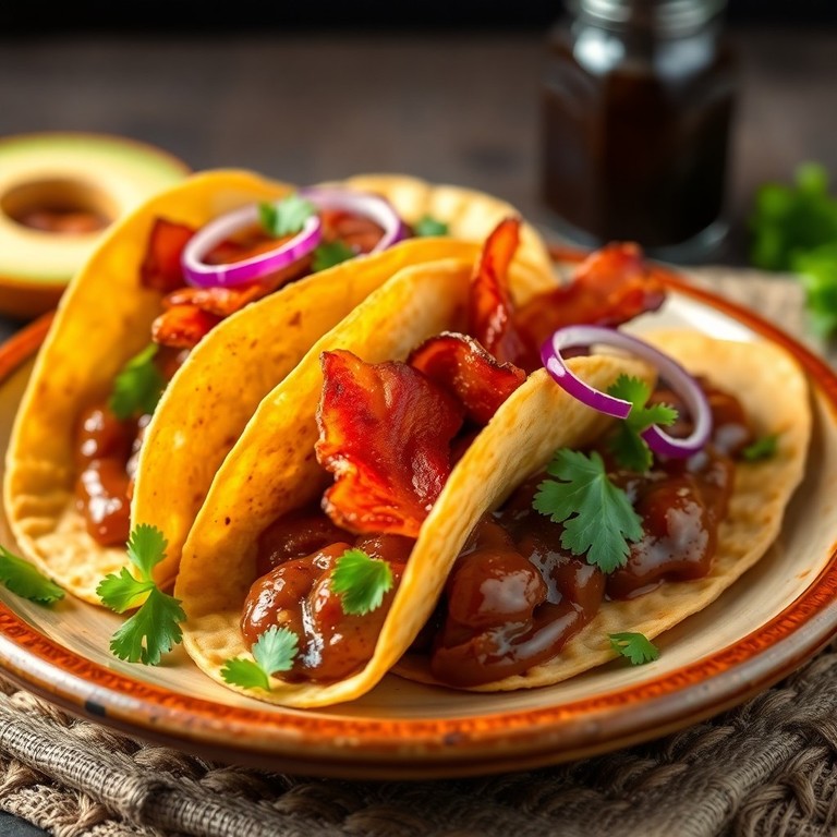Tacos de Mole con Tocino Crujiente
