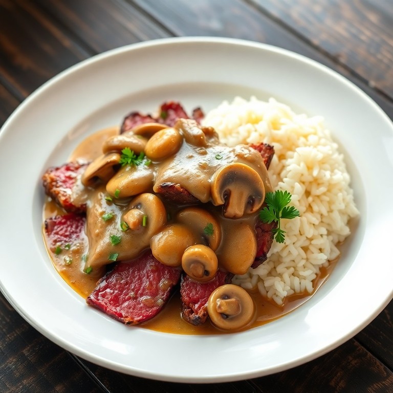 Une recette gourmande de bavette de bœuf accompagnée d'une sauce onctueuse aux échalotes et champignons, servie avec un riz blanc moelleux. Parfaite pour un dîner raffiné où la simplicité des ingrédients révèle toute la saveur de la viande et la richesse de la sauce.