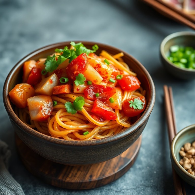 Ароматное и пикантное блюдо в корейском стиле с мивиной, обжаренным салом, помидорами и луком. Отличается насыщенным вкусом и ярким ароматом, идеально подходит для любителей острой и сытной еды.