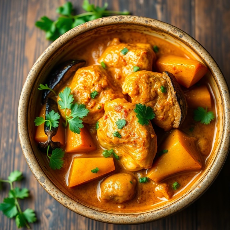 Un curry épicé et crémeux mettant en valeur la richesse des saveurs d’Asie du Sud, préparé avec des cuisses de poulet entières pour plus de saveur et de tendreté, accompagné de patates douces, pommes de terre et aubergines pour un plat réconfortant et savoureux.