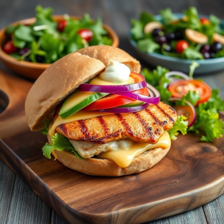Un burger savoureux et riche en protéines, idéal pour un dîner destiné à la prise de masse musculaire. Ce burger combine un filet de poulet grillé assaisonné, du fromage allégé, des légumes frais et une sauce légère au yaourt pour un repas complet et équilibré, prêt en seulement 20 minutes.