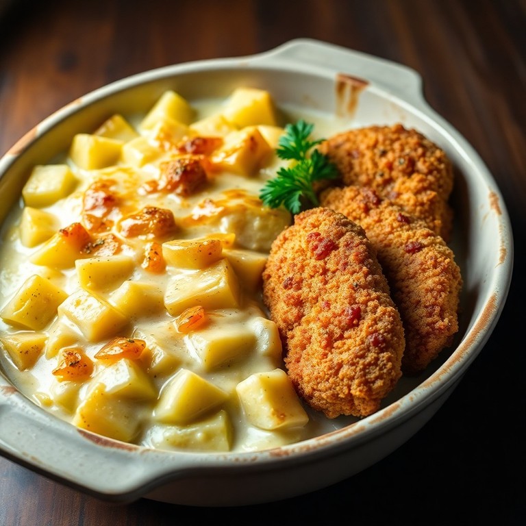 Un plat réconfortant pour 4 personnes, combinant un gratin de pommes de terre en cubes fondants et une garniture d'aiguillettes de poulet panées et frites, croustillantes à souhait. Parfait pour un dîner convivial et gourmand.