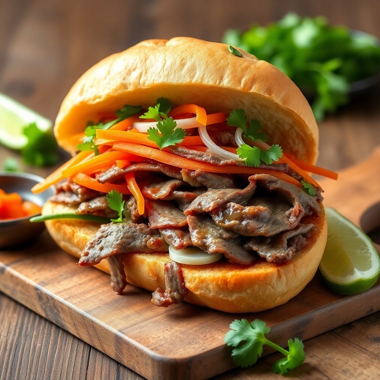 Un sandwich vietnamien classique combinant un bœuf mariné savoureux, des légumes croquants marinés et de la coriandre fraîche, servi dans une baguette croustillante. Parfait pour une expérience de street food vietnamienne à la maison.