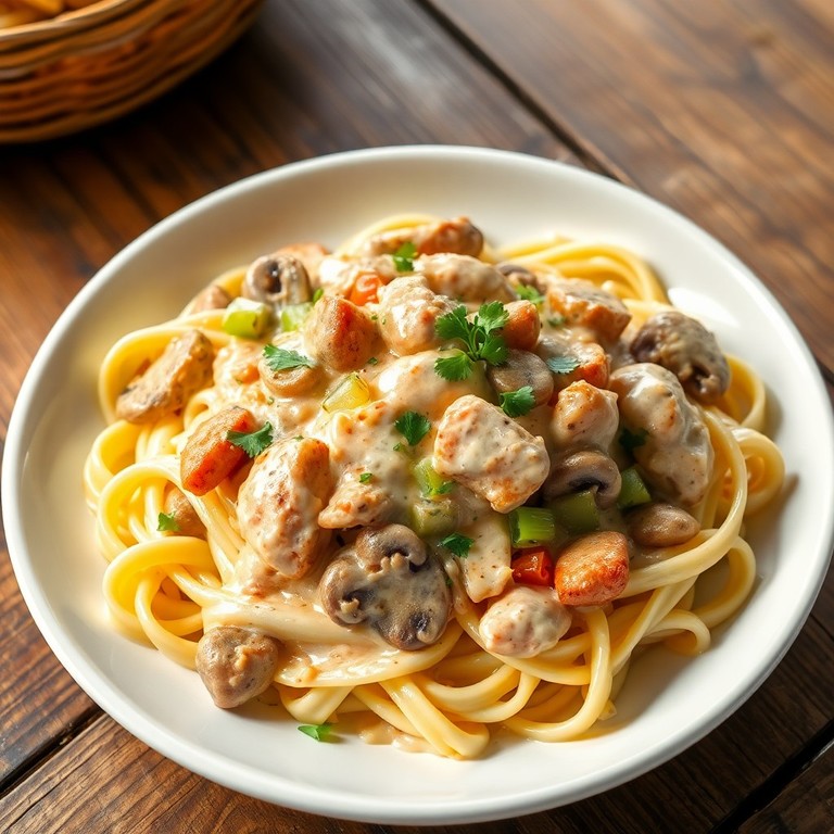 A rich, comforting Italian-inspired dish featuring tender chicken, mushrooms, celery, and peppers in a luscious heavy cream Alfredo sauce served over fettuccine pasta. This recipe balances savory flavors and creamy textures for an indulgent yet approachable meal.