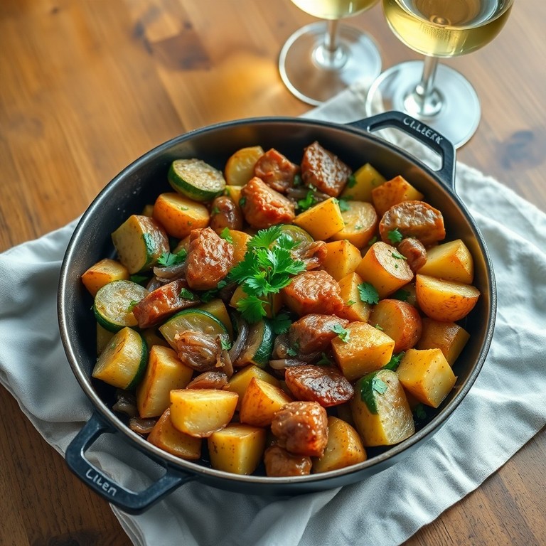 Une poêlée rapide et savoureuse qui met en valeur le sauté de porc tendre accompagné de courgettes fraîches et de pommes de terre dorées, relevée par des oignons caramélisés et une touche d'ail et thym.