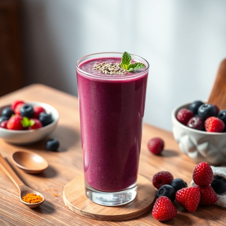 Un smoothie rafraîchissant et nutritif, riche en antioxydants et en ingrédients anti-inflammatoires comme les baies, les graines de chia et le curcuma. Parfait pour un petit déjeuner sain et rapide, il combine douceur, fraîcheur et bienfaits pour la santé.