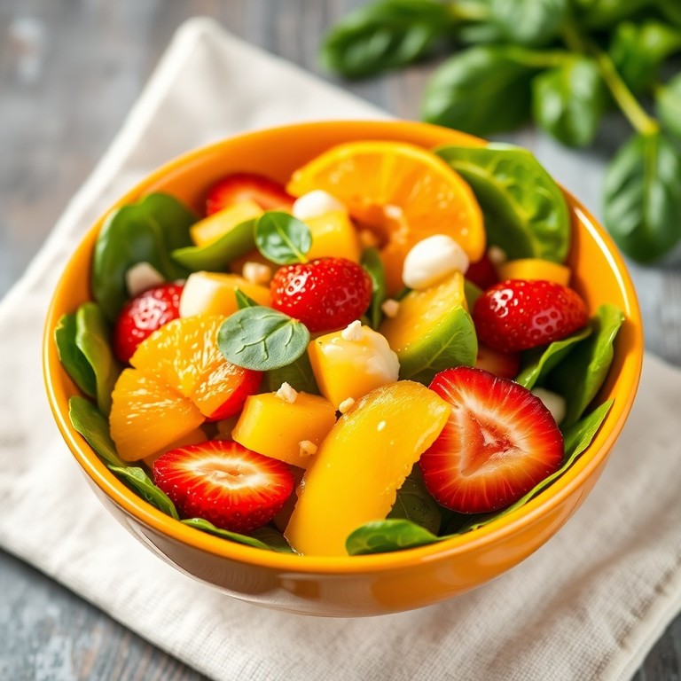 Una ensalada fresca y colorida que combina frutas tropicales y espinaca, ideal para un almuerzo ligero y saludable en menos de 15 minutos. La vinagreta de miel y naranja aporta un toque cítrico y dulce que realza los sabores naturales de la fruta y la verdura.