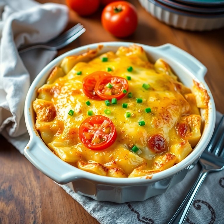 Ein cremiger Kartoffel-Hähnchen-Auflauf mit frischen Tomaten und aromatischem Schnittlauch, der durch eine goldbraune Käsekruste gekrönt wird. Dieses herzhafte Gericht verbindet zarte Hähnchenstücke mit milden Kartoffeln und einer würzigen Sahnesauce – perfekt für ein gemütliches Abendessen.