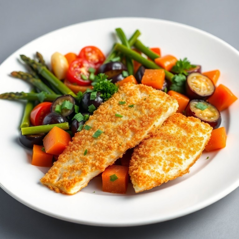 Une recette croustillante de poisson panné accompagnée d'un mélange savoureux de légumes sautés : poireaux, tomates, aubergines, carottes et asperges, relevés par des herbes fraîches comme la ciboulette, le persil et la coriandre. Ce plat offre un délicieux contraste de textures entre le croustillant du poisson et la fraîcheur des légumes, idéal pour un repas équilibré et gourmand.