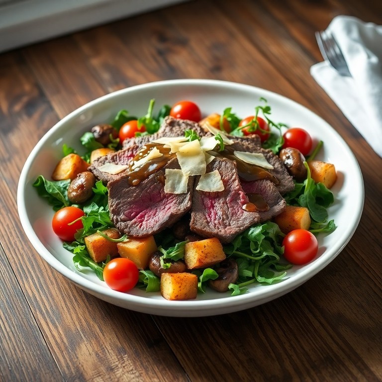 Свежий и сытный теплый салат с тонко нарезанной говядиной, сочными помидорами черри, обжаренными шампиньонами, нежным картофелем и ароматной рукколой, заправленный легким медово-бальзамическим соусом и украшенный пармезаном.