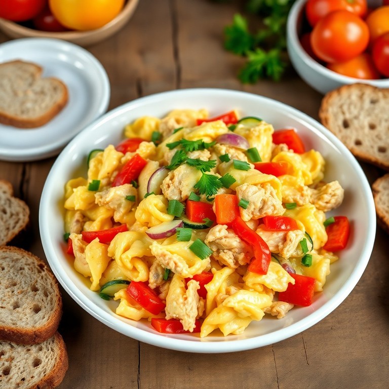 Un desayuno nutritivo y lleno de sabor que combina pechugas de pollo cocidas con huevos revueltos y verduras frescas, listo en menos de 15 minutos.