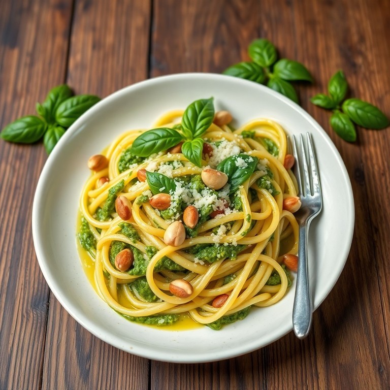 Una salsa tradicional italiana de pesto elaborada con albahaca fresca, piñones, ajo y queso parmesano, ideal para acompañar cualquier tipo de pasta y preparar en pocos minutos.