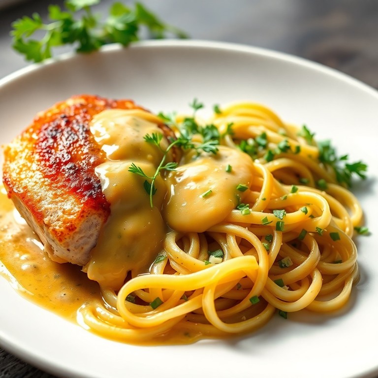 Un plat savoureux où le cordon bleu est nappé d’une sauce riche et onctueuse à base de crème et de moutarde, accompagné de pâtes sautées aux herbes fraîches pour un dîner élégant et réconfortant.