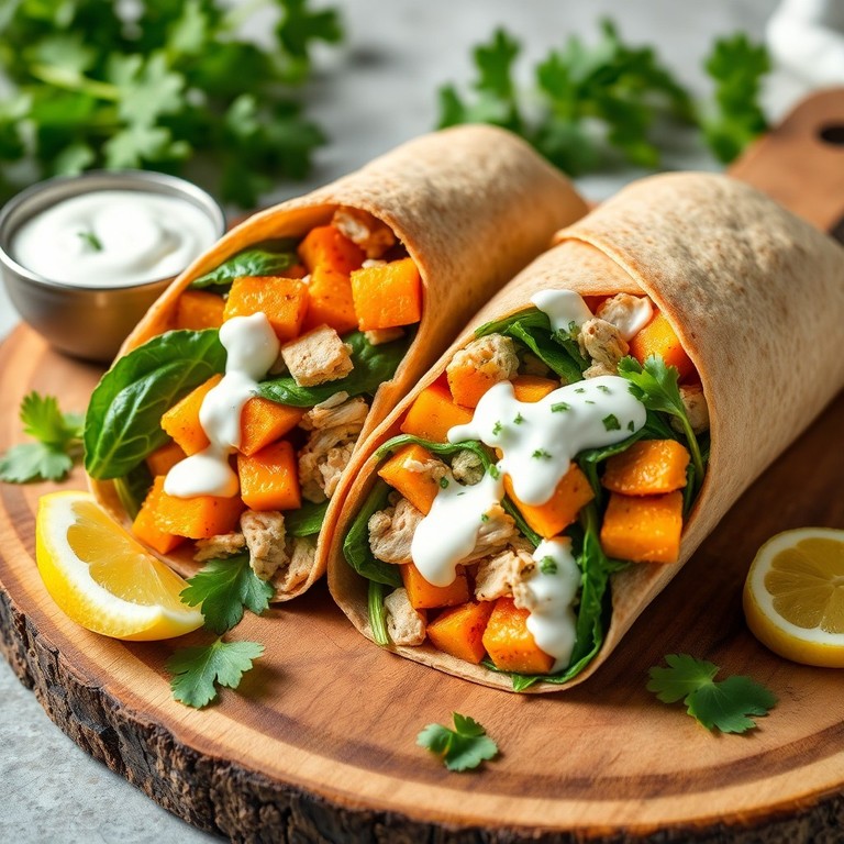 A quick and healthy wrap recipe combining roasted sweet potatoes and tender rotisserie chicken, perfect for a quick dinner in under 20 minutes. This dish features the natural sweetness of roasted sweet potatoes paired with savory rotisserie chicken, fresh greens, and a tangy yogurt sauce, all wrapped in a soft tortilla for a satisfying meal.
