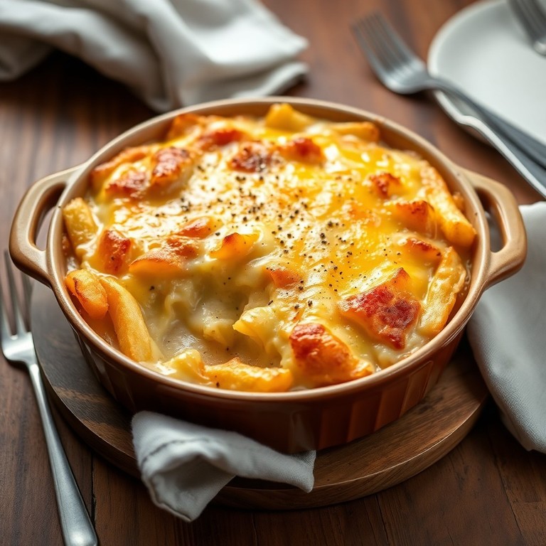 Un gratin croustillant et fondant, préparé rapidement avec des frites surgelées, une crème entière épaisse et du gruyère râpé, parfait pour un repas simple et gourmand.