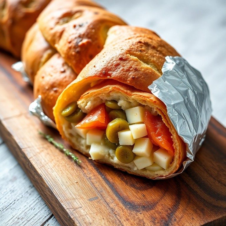 Une délicieuse baguette garnie d'un mélange crémeux au gruyère, St Moret, œufs durs, cornichons et saumon fumé, parfaite pour l'apéritif. Ce remplacement du jambon par le saumon fumé apporte une touche marine et raffinée à cette recette classique.