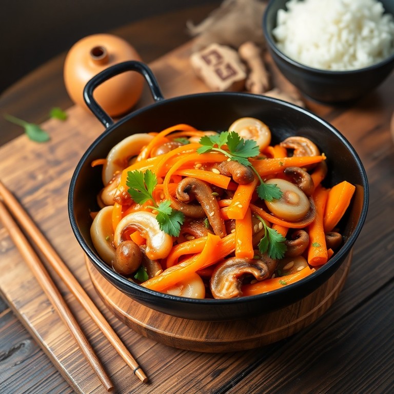Un sauté rapide et savoureux combinant des carottes croquantes, des champignons parfumés et des oignons grelots tendres, le tout relevé d'une sauce soja au gingembre frais pour une touche asiatique authentique.