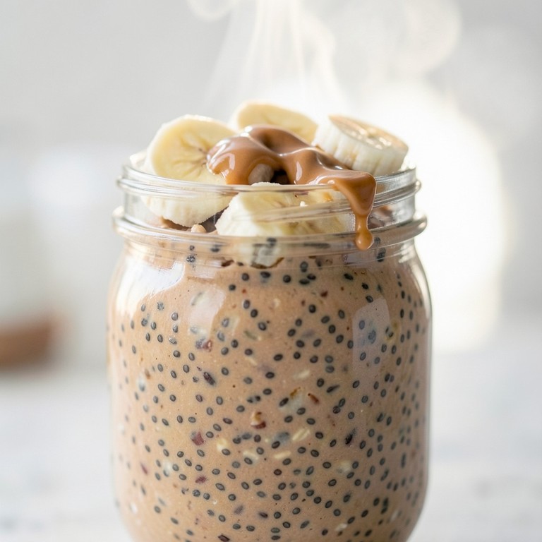 Un mélange riche en protéines avec du beurre de cacahuète, des graines de chia et une base crémeuse de lait et d'avoine, parfait pour un petit-déjeuner nutritif et rapide.