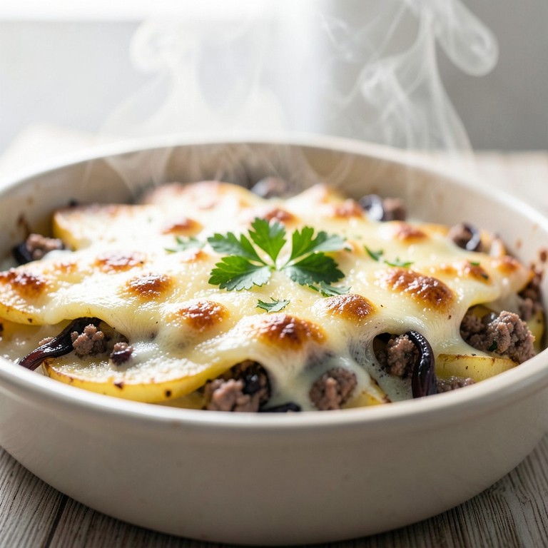 A comforting and hearty bake featuring layers of tender potatoes, savory seasoned beef, and sweet caramelized onions enveloped in a velvety nutmeg-infused cream sauce.