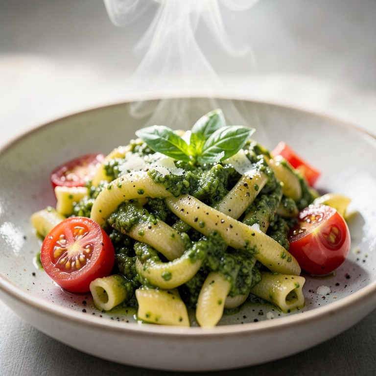 A quick and easy pasta dish featuring a vibrant zucchini pesto and diced fresh tomatoes, cooked entirely in the microwave.