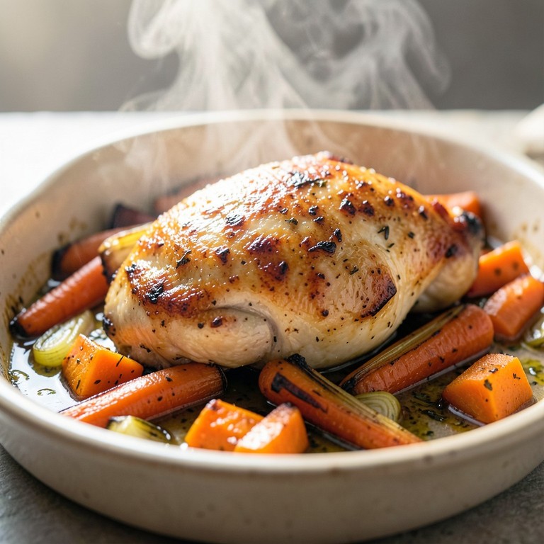 Un plat réconfortant et sain composé de cuisses de poulet juteuses et d'un mélange de légumes d'hiver fondants, le tout rôti ensemble pour un repas complet et savoureux.