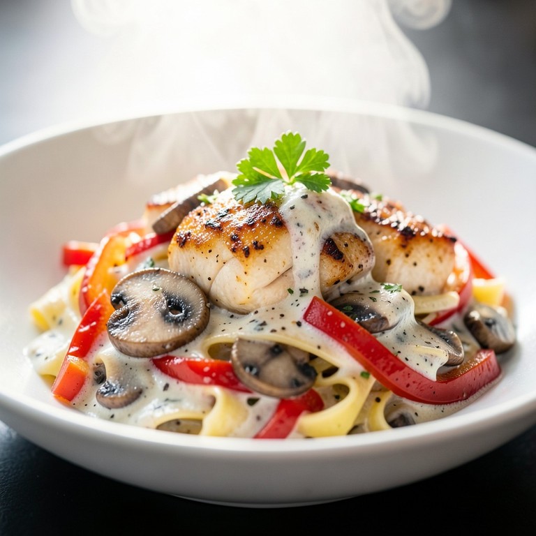 Pâtes crémeuses au poulet, champignons et poivrons