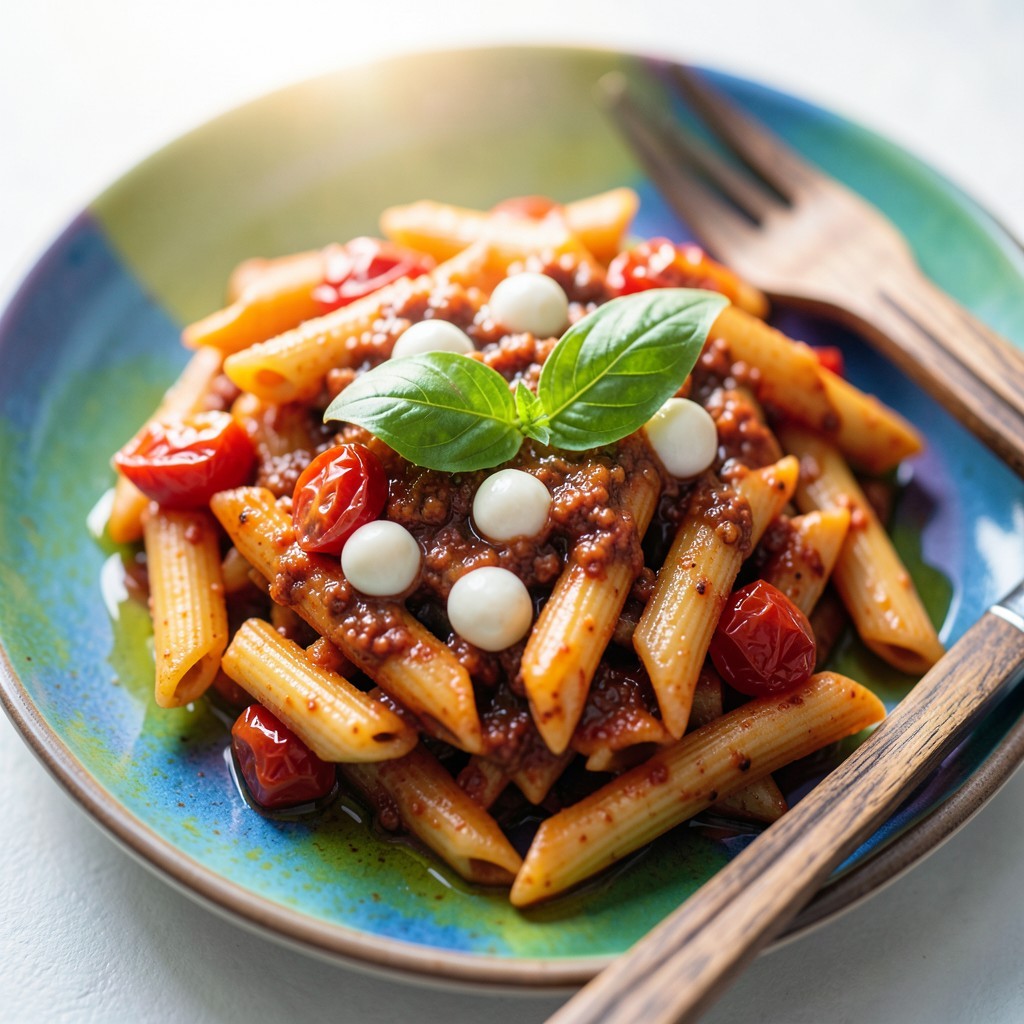 Une version intense et gourmande de penne au pesto rouge, sublimée par la douceur des tomates confites, la fraîcheur du basilic et l'onctuosité de la mozzarella.