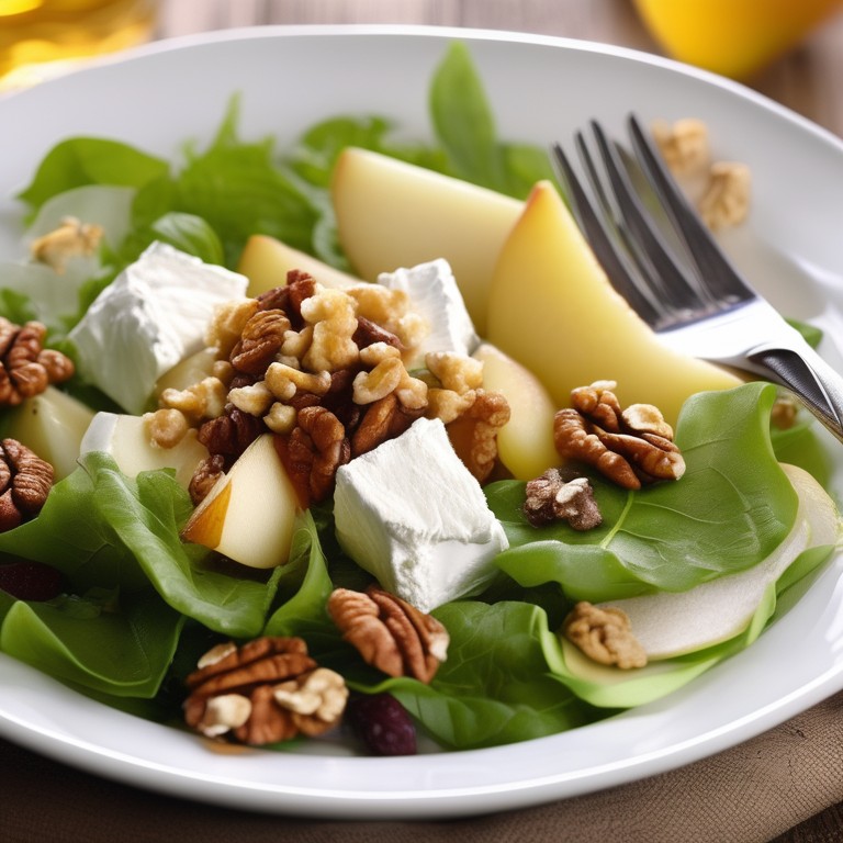 Une salade fraîche et délicieuse avec du fromage de chèvre chaud, des noix croquantes et des poires juteuses.