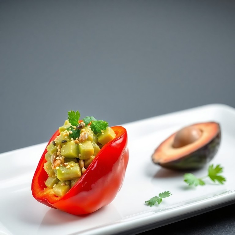 - Peperone rosso ripieno crudo con germogli di bamboo e avocado