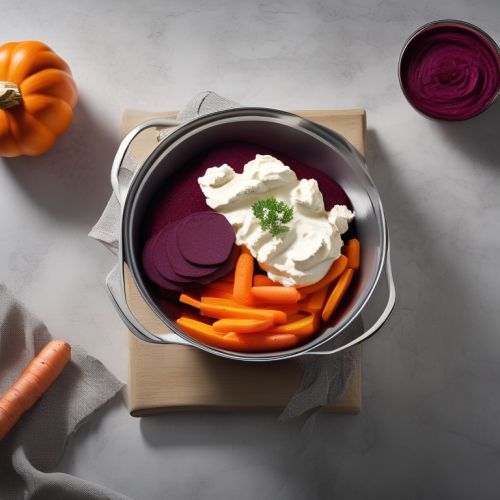 Gemüsepfanne mit Kürbis, Karotten, Rote Beete und Frischkäse