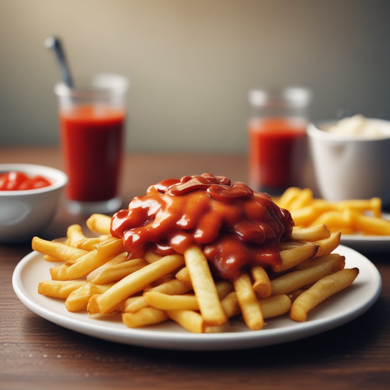 Une recette délicieuse de frites croustillantes avec du fromage cheddar fondu et des sauces barbecue, ketchup et blanche onctueuses. Parfaites pour une collation savoureuse ou un repas amusant!