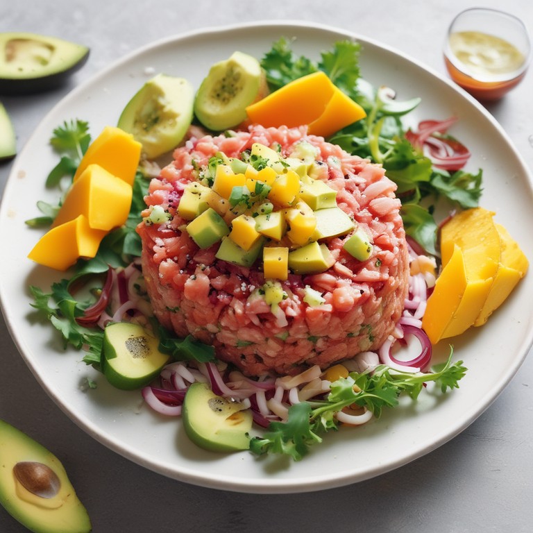 Этот тартар из тунца с авокадо и манго - идеальное блюдо для любителей свежих и легких закусок. Сочетание тунца, авокадо и манго создает неповторимый вкус, а соус из соевого соуса, оливкового и кунжутного масел придает блюду пикантность.